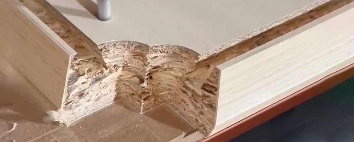 Die gezeigten Beispiele werden auf einfachen CNC-Bearbeitungszentren mit Rastertisch gefräst. Auf ihm liegt eine luftdurchlässige Verschleissplatte. Durch sie hindurch werden die Werkstücke angesaugt. Sowohl Gehrungsbearbeitung als auch Längsfräsungen der schmalen Teile erfolgen an der ganzen Platte, erst ganz zum Schluss werden sie abgetrennt.