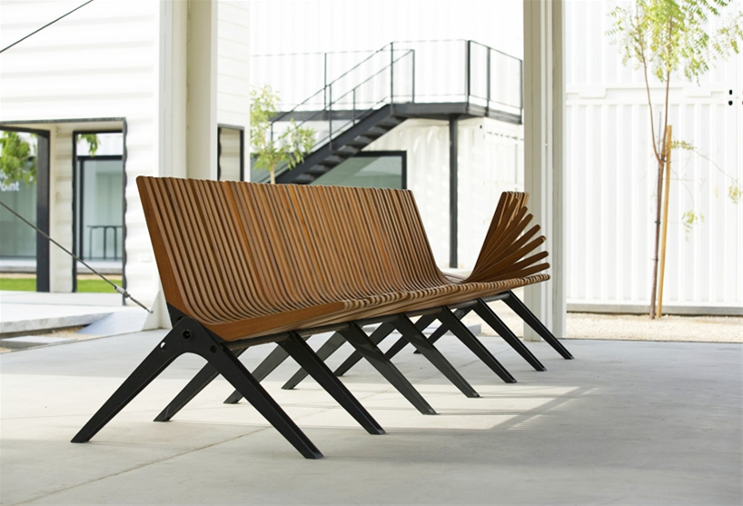Das System basiert auf Bumerang-förmigen Einzelteilen aus Holz, die auf einer Stahl-Unterkonstruktion drehbar gelagert sind. Weil sich auf der langen, horizontal verlaufenden Achse jeder Teil einzeln bewegen lässt, wird die Bank sehr variabel. Aufgrund der raffinierten Kippbewegung wird die Sitzfläche zur Lehne und umgekehrt.