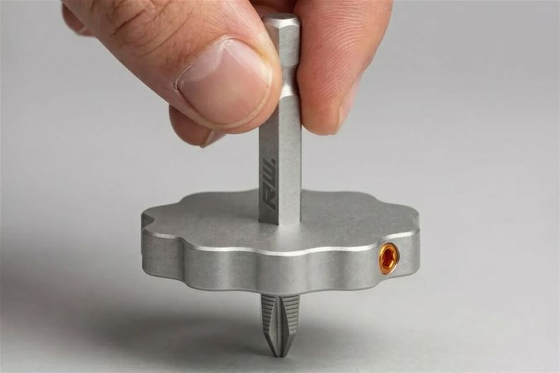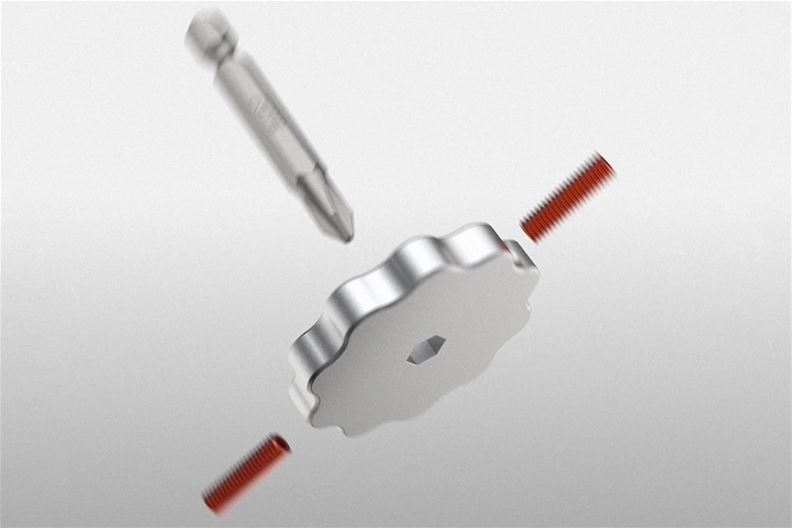 Der «Drillbit Gyro» von Julius Works besteht aus einem Standard-1/4-Zoll-Sechskantbit, einer Scheibe mit passendem Ausschnitt sowie zwei orangen Madenschrauben. Ein Innensechskant-Schlüssel zum Anziehen ist ebenfalls im Lieferumfang enthalten. Weil die beiden Schrauben zum Fixieren des Bit einander gegenüberliegen, ist das Ganze sauber ausbalanciert. Mit zwei Fingern kann man den Kreisel am Bit-Schaft zum Drehen bringen.