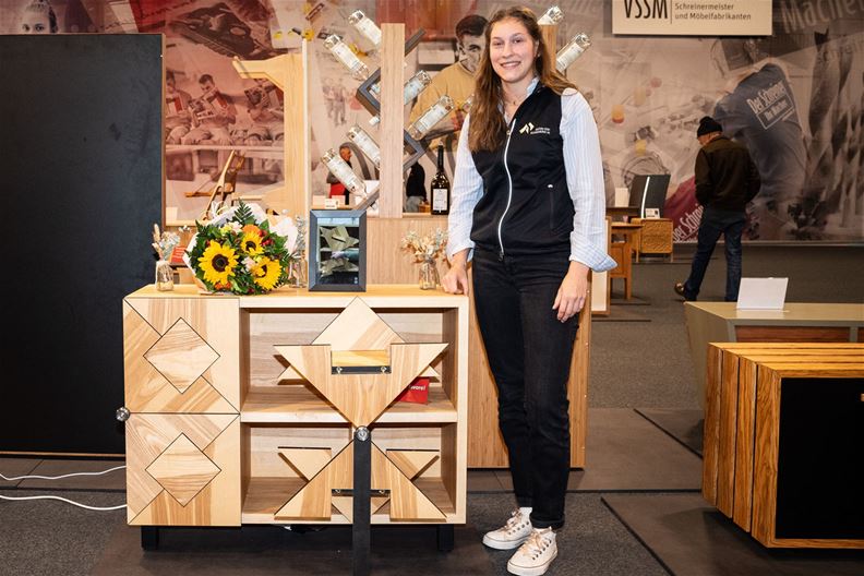 Laura Frick mit ihrem Sideboard, das vom Messepublikum am meisten Stimmen erhalten hat.