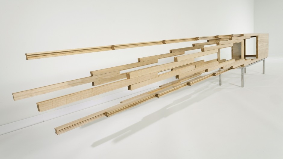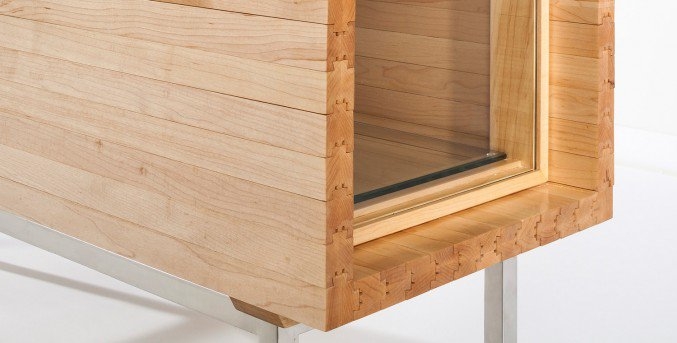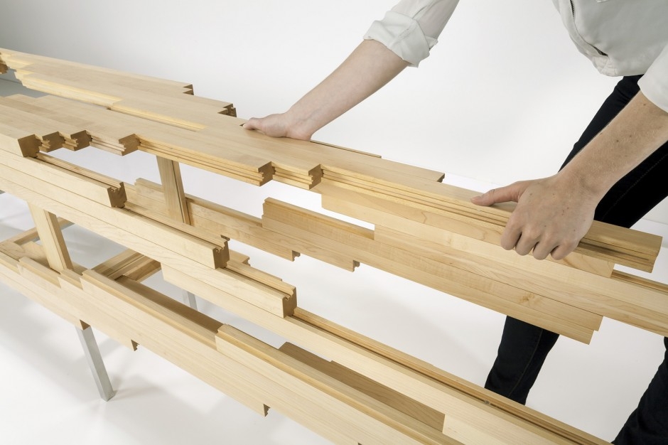 Beim Entwurf orientierte sich der New Yorker Designer an traditionellen Techniken des Schreiner-Handwerks: Längs angekehlte Schwalbenschwanzprofile ermöglichen die Schiebebewegungen zwischen den einzelnen Massivholzleisten. Die Mechanik des Möbels ist aber derart komplex, dass bis zu seiner Fertigstellung ein ganzes Jahr verging.