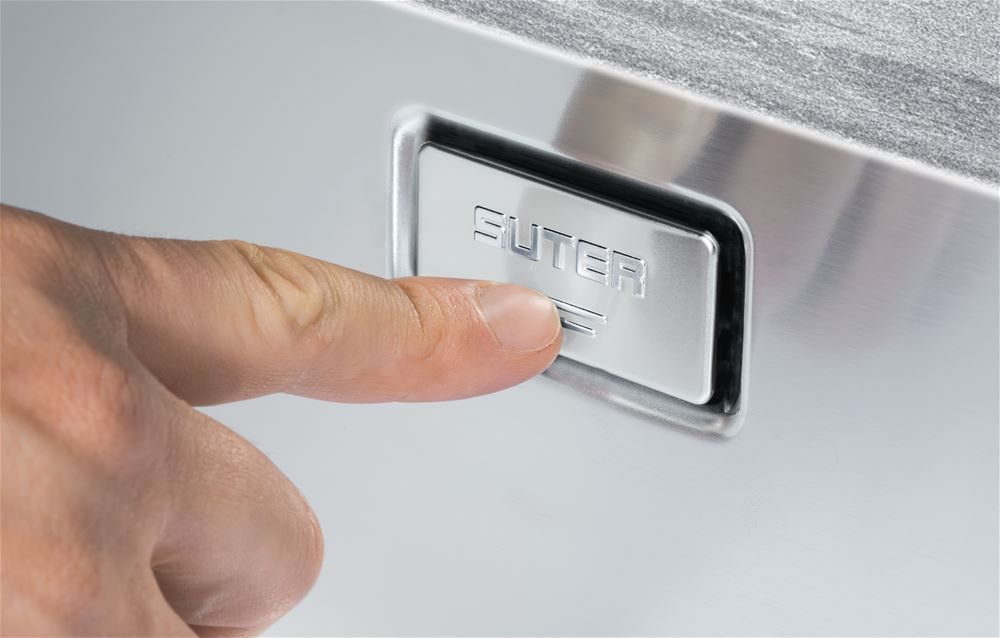 Das Ablaufventil Touch Flow ist eine neue Entwicklung von Suter Inox. Mit einem leichten Druck auf die Überlaufkappe schliesst oder öffnet sich mittels einer elektronischen Steuerung automatisch das Ablaufventil. So behalten die Küchennutzer stets trockene und saubere Hände.