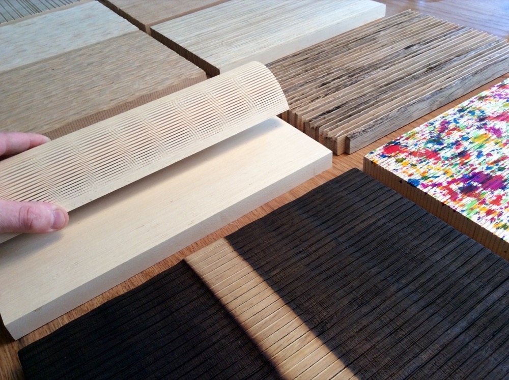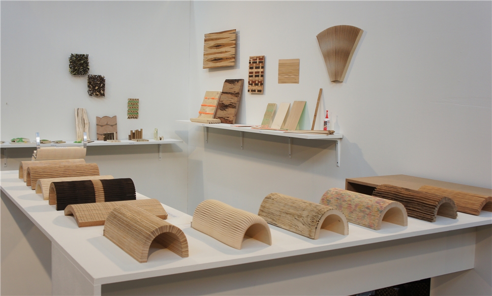 Holzwerkstoffe bestehen aus einem Kern und einer verleimten Deckschicht. In zahlreichen Versuchen kam Tim Kündig auf eine überzeugende Lösung. Er verleimt unterschiedliche Hölzer und Furniere zu einer netzwerkartigen Struktur und gewinnt dabei zwei Vorteile: einerseits minimiert er den Leimverbrauch, anderseits gewinnt sein Werkstoff eine hohe Flexibilität. Das additive Verfahren unterscheidet sich von Verfahren wie Dukta, bei dem das Material gitterartig eingeschnitten wird.