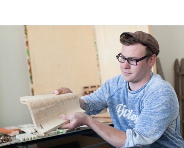 Gibt es neue Holzwerkstoffe? Tim Kündig, der nach einer Schreinerlehre einen Bachelor in Materialdesign macht, will die Frage konkret beantworten. In seiner breit angelegten Recherche suchte er nach Möglichkeiten, einen Werkstoff zu entwickeln, der die mechanischen Eigenschaften und die Schönheit von Holz bewahrt.