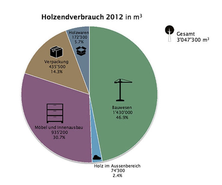 Die stoffliche Nutzung von Holz stieg 2012 im Vergleich zu 2009 um rund 10% auf über 3 Mio. Kubikmeter. Von diesen entfiel der mit 47% grösste Anteil auf das Bauwesen. An zweiter Stelle stehen der Innenausbau und Möbel mit rund 30%. Verpackungen und Holzwaren erreichten zirka 20%.
