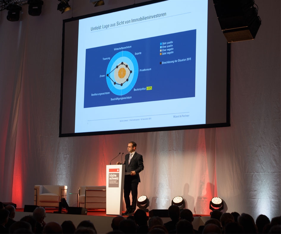 Fabio Guerra vom Beratungsunternehmen Wüest & Partner erläuterte die Küchenmarkt-Studie 2015. Für das kommende Jahr prognostiziert er stabile Verhältnisse. Da im Neubaubereich die Mietwohnungen zunehmen, Einfamilienhäuser und Eigentumswohnungen dagegen einbüssen, wird der Druck auf die Margen aber wohl grösser. Dies besonders bei Küchen im oberen Preissegment.
