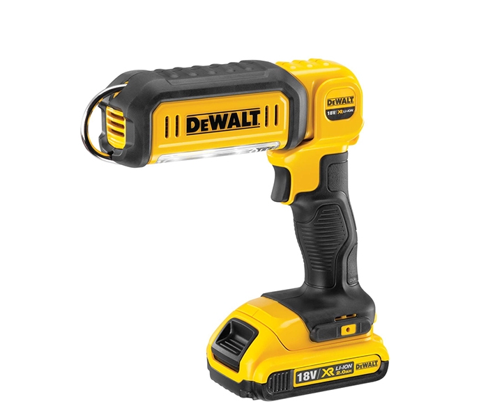 Die Akku-Lampe «DCL 050» kann freistehend genutzt, aber auch in der Hand gehalten oder am integrierten Haken aufgehängt werden. Sie übersteht einen Fall aus zwei Metern, ist staub- und spritzwassergeschützt und wiegt mit einem 2,0-Ah-Akku nur 1 kg.
