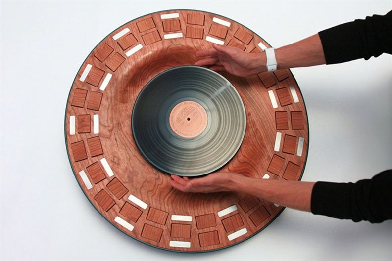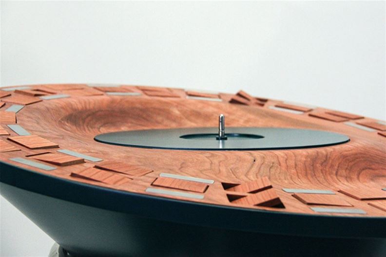 Auf den ersten Blick sieht der «Orbit» aus wie ein klassischer Plattenspieler. Er ist umgeben von 39 Massivholzplättchen, die in konzentrischen Kreisen angeordnet sind. Während sich der Tonträger dreht, reagieren diese Plättchen auf Frequenz und Amplitude der Musik, drehen und wenden sich und erzeugen so ständig wechselnde Licht- und Schattenspiele. Es wirkt, als würde die Musik tanzen.