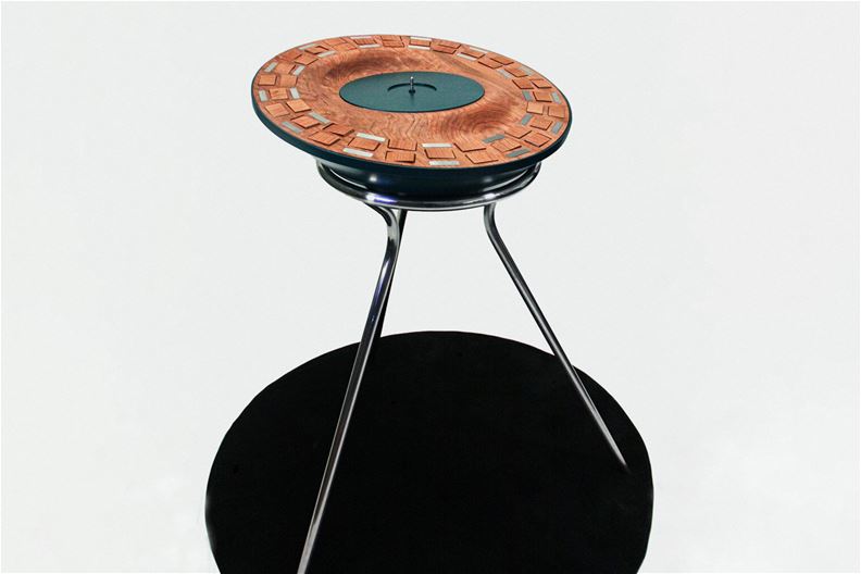 Dünne Edelstahleinlagen sind in die Fläche aus Kirschbaumholz eingearbeitet. Jedes der CNC-gefrästen Kirschbaum-Plättchen ist sorgfältig ausbalanciert, so dass es präzise auf die empfangenen Audiosignale reagiert. Bassbetonte Songs aktivieren zum Beispiel die äusseren Ringe stärker, während hohe Töne die inneren Plättchen anregen.
