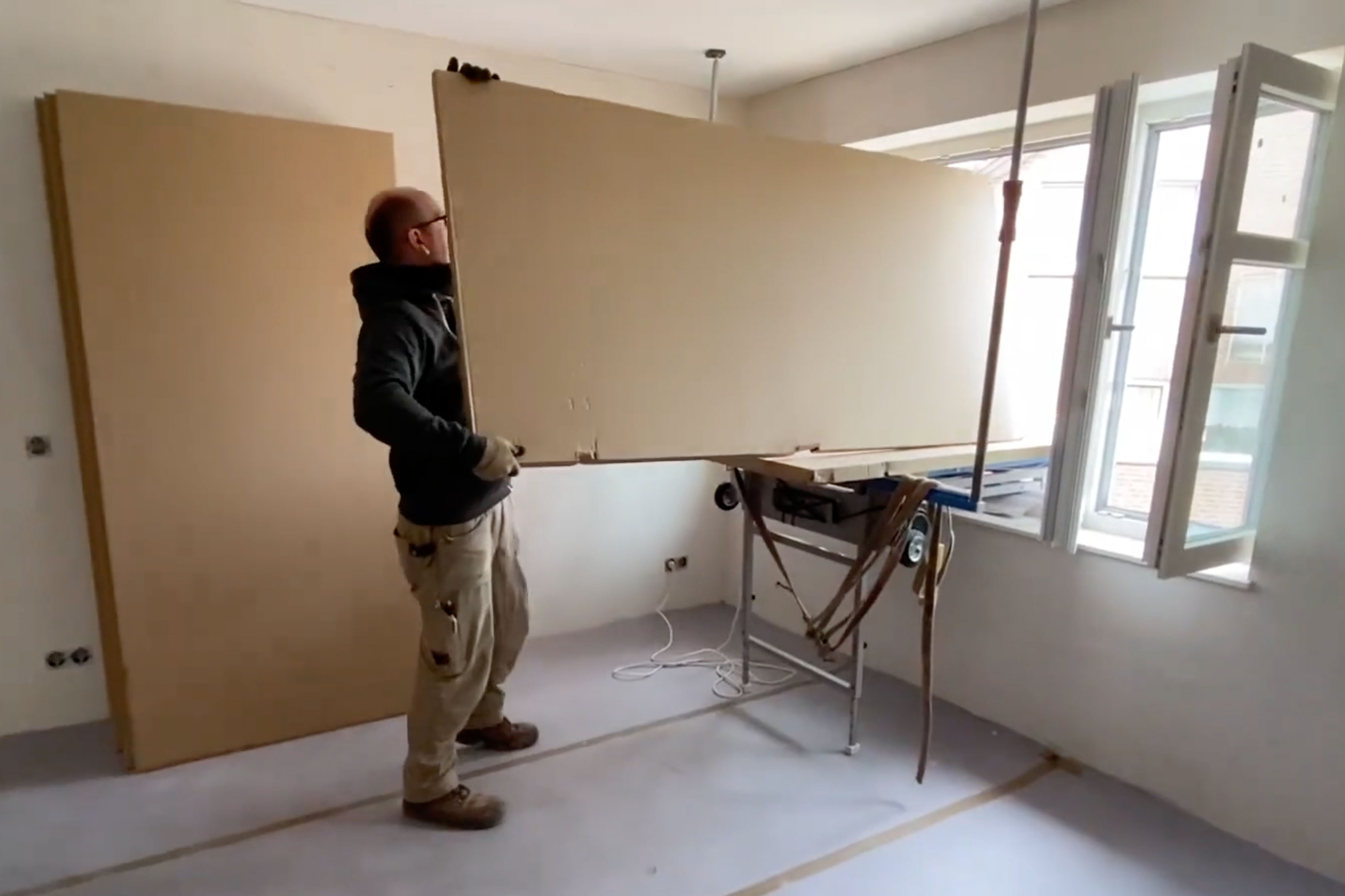 Sobald die Last auf der passenden Höhe ankommt, leitet die Seilwinde sie schonend auf die Plattform. Diese schwenkt dann automatisch in die Horizontale. Dadurch lassen sich die transportieren Elemente einfach und sicher abladen und im Geschoss verteilen. Wenn der «Bau-Lift mini Flipper» mühsame körperliche Arbeit reduziert, schont er einerseits die Gesundheit der Mitarbeitenden, andererseits beschleunigt er so den Bauablauf.