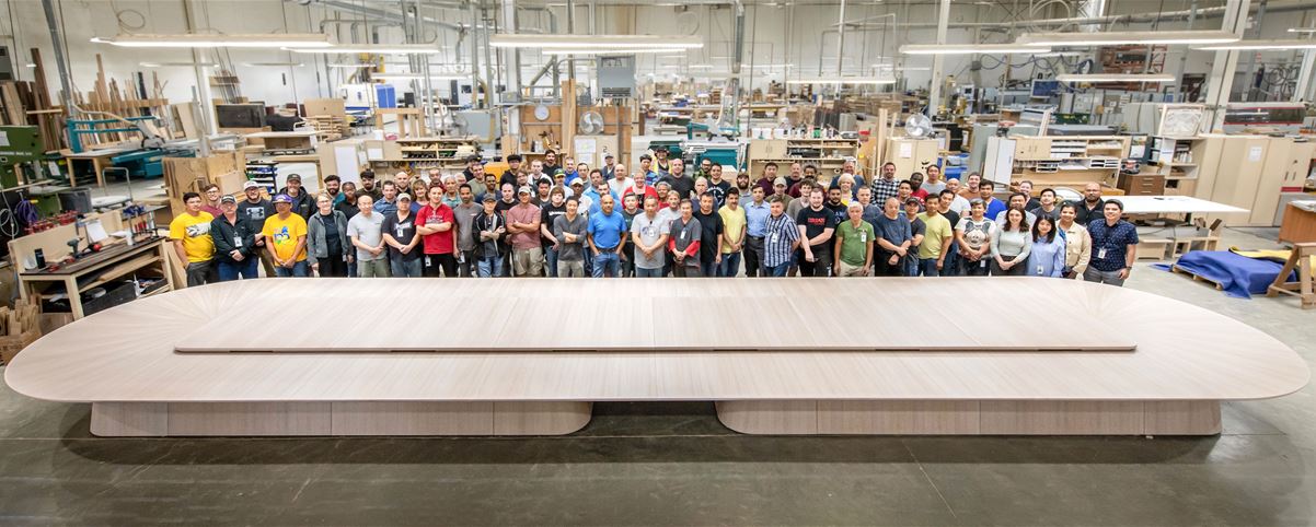 Hergestellt wurde das repräsentative Einzelstück vom kanadischen Unternehmen Teknion. Aufgrund der beeindruckenden Grösse des Tisches erforderte er das Furnier von zwei mächtigen Kanadischen Eichen. Um die farblichen Unterschiede der beiden Stämme auszugleichen, wurde das Holz leicht gebeizt. Der Beizton verleihe dem Tisch auch einen ausdrucksstarken und zugleich dezenten diplomatischen Touch, so der Innenarchitekt.