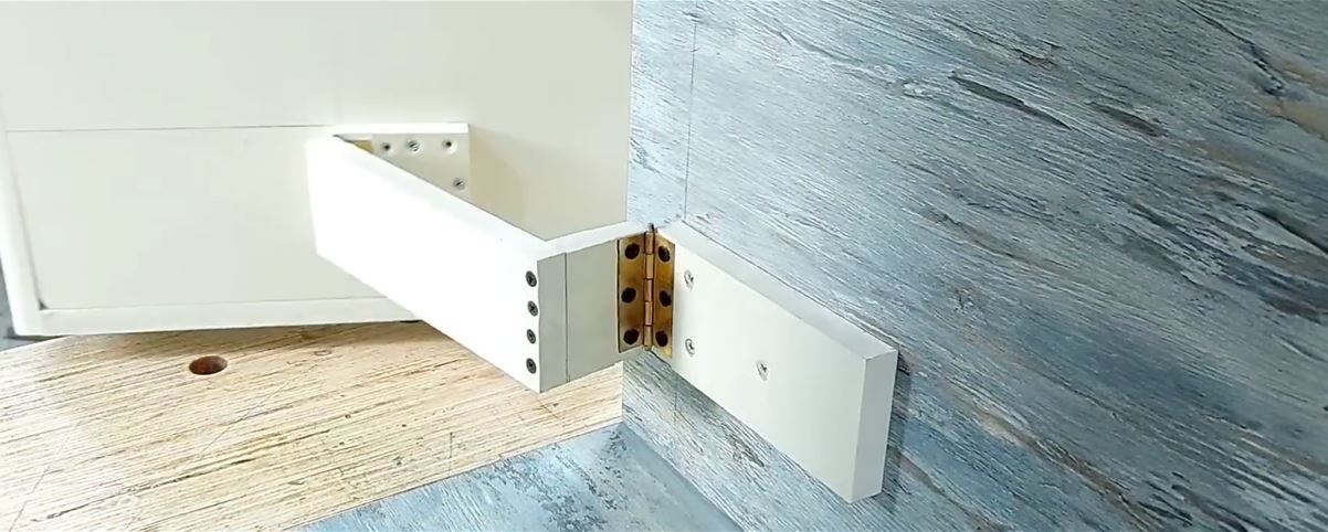 Das Modell im Video ist aus Foam Board hergestellt. Es zeigt das Funktionsprinzip, ist aber überhaupt nicht ausgereift. Weil das System nicht unten geführt ist, sondern ähnlich wie eine Schranktüre mit Scharnieren bewegt wird, liegt der Knackpunkt bei der Stabilität. Dabei spielt das Eigengewicht des auszuschwenkenden Elements schon eine grosse Rolle, dazu kommt die Beladung durch die Gegenstände.
