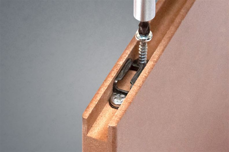 Der verdeckt liegende «Knapp Modular» ist ein selbstspannender Zargen- und Korpusverbinder. Er eignet sich besonders für Kasteneckverbindungen, Einschubtablare und Mittelböden. Weil man ihn innert Sekunden wieder lösen kann, ist er eine gute Variante für Möbel, die wiederholt zusammengebaut und demontiert werden. Er lässt sich in allen Plattenmaterialien ab 16 mm einsetzen.