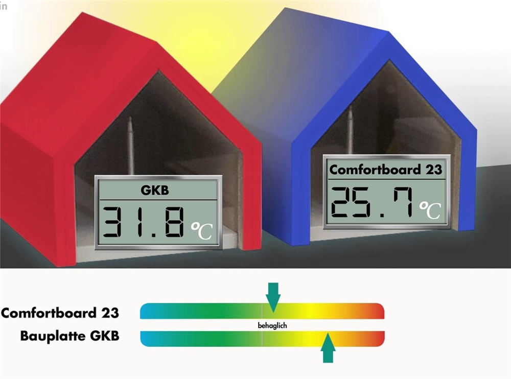Mit «Comfortboard» bietet Knauf eine neue Möglichkeit, das Raumklima zu beeinflussen. In die Platte werden mikroskopisch kleine, mit Wachs gefüllte Perlen als Zuschlagstoff eingebunden. Deren Kern schmilzt bei einer Temperatur um 23 °C, nimmt dadurch Wärme auf und reduziert so den Temperaturanstieg. Sinkt nachts die Raumtemperatur, wird die gebundene Wärme wieder freigesetzt. Der Kern kühlt ab, erstarrt und ist bereit, am folgenden Sommertag die nächste Temperaturspitze aufzunehmen.