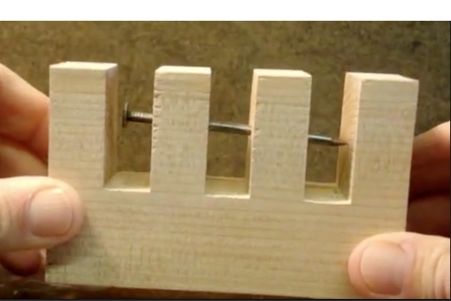 Wer die Eigenschaften von Massivholz kennt und ausreizt, stellt Erstaunliches fest: Der Teil links aussen am Muster lässt sich nach entsprechender Vorbehandlung etwa auf seine halbe Höhe zusammenpressen, so dass von dieser Seite gebohrt und der Nagel eingeschoben werden kann.
